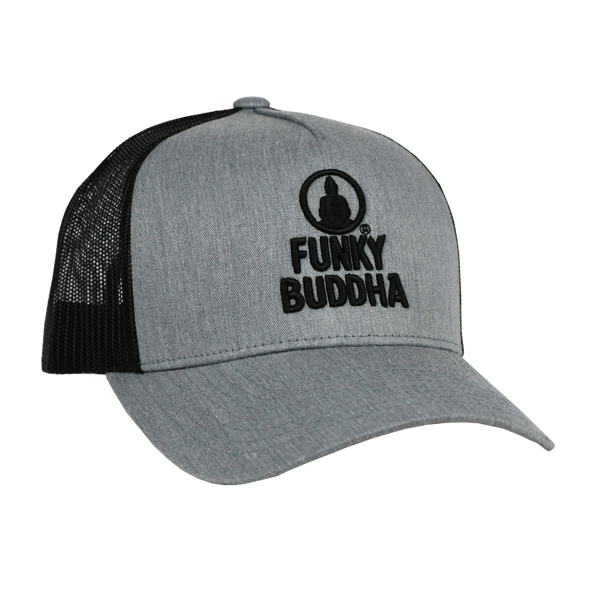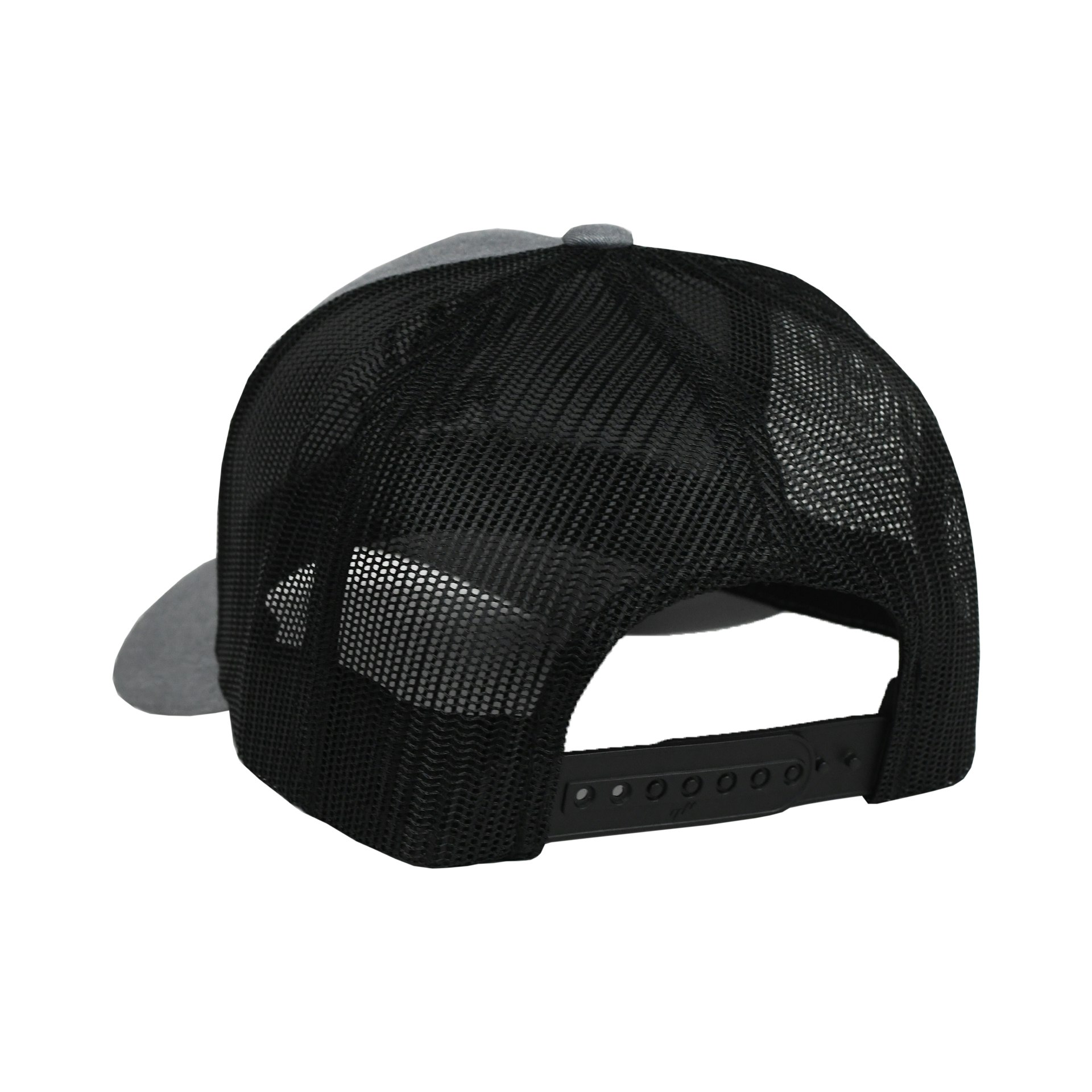 Five panel trucker hat with puff embroidered logo and snapback closure.