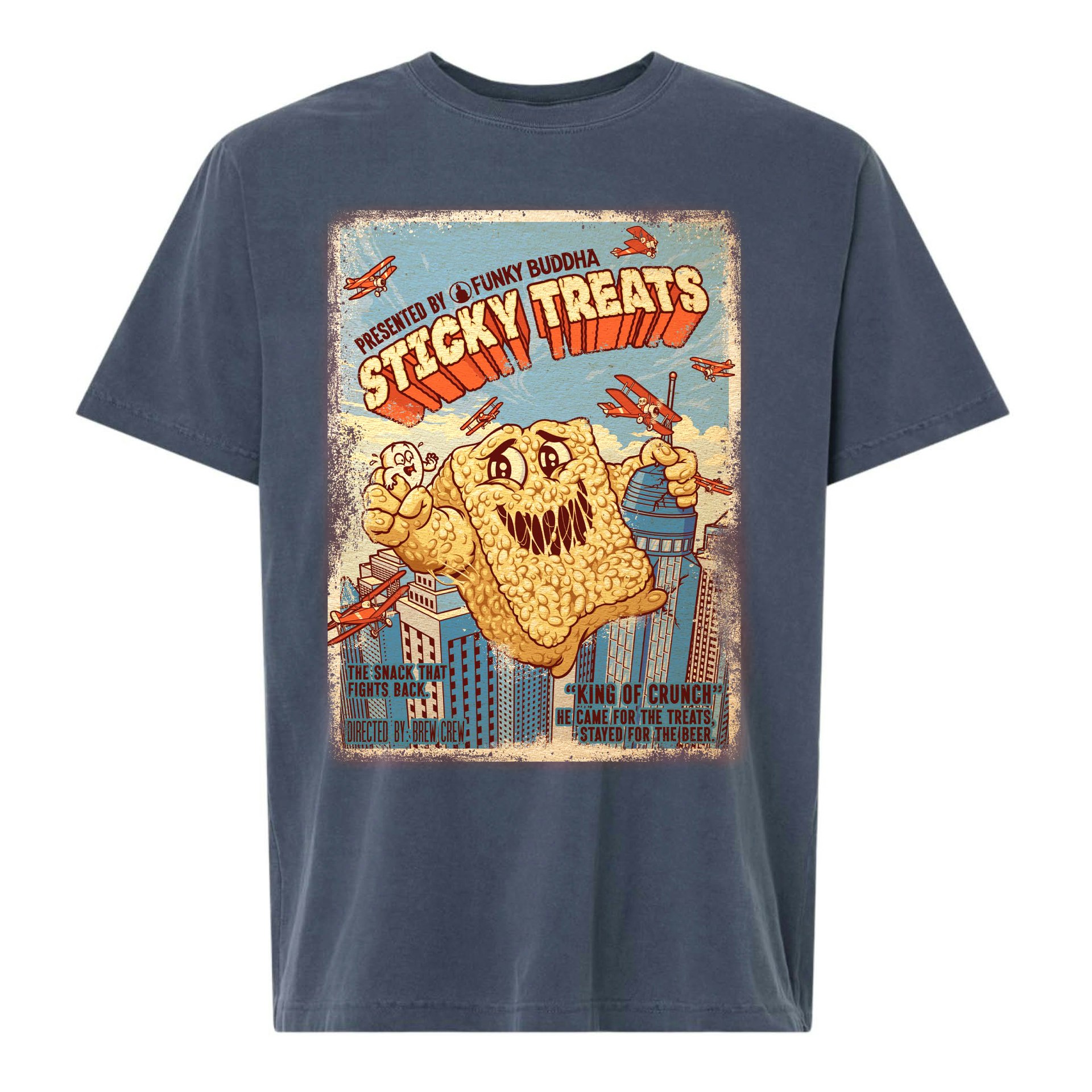 Heavyweight washed navy tee featuring vintage movie poster-inspired art.
